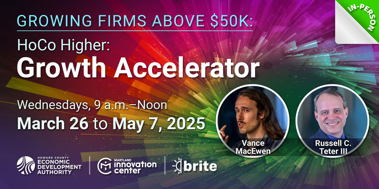HoCo Higher: Growth Accelerator is designed for growth companies generating above $50K but under $250K in revenue. This 7-week in-person program at the Maryland Innovation Center offers you the opportunity to work ON, not IN, your business. With expert coaching you'll develop a market strategy, generate customers, create a growth plan, identify actionable priorities, find funding pathways and produce a compelling business pitch. |