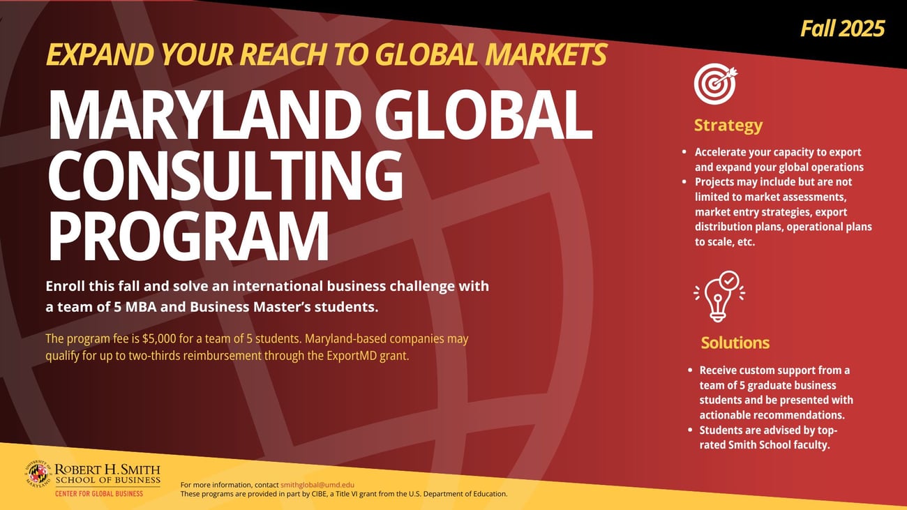 Is your business ready to reach international markets? The Maryland Global Consulting Program is designed to equip Maryland companies with the tools, expertise, and connections needed to grow globally. By participating, you’ll gain direct access to tailored strategies, expert support, and practical recommendations to help your business succeed on the world stage.