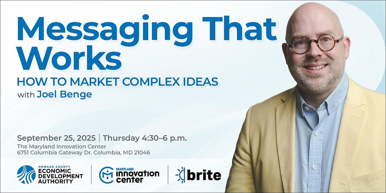 Join us in person at the Maryland Innovation Center for Messaging That Works: How to Market Complex Ideas, a practical workshop led by Joel Benge, communications strategist and author of Be a Nerd That Talks Good. Joel has worked with organizations from NASA to Nickelodeon—and now helps startups and technical experts turn complex concepts into messages that inspire action.